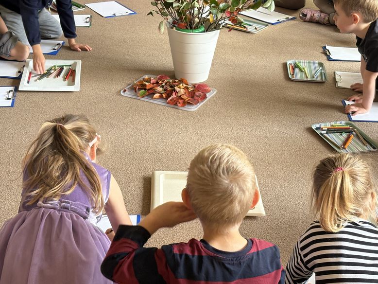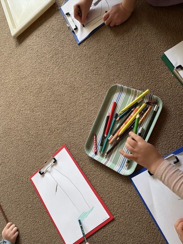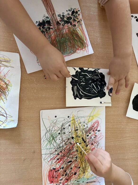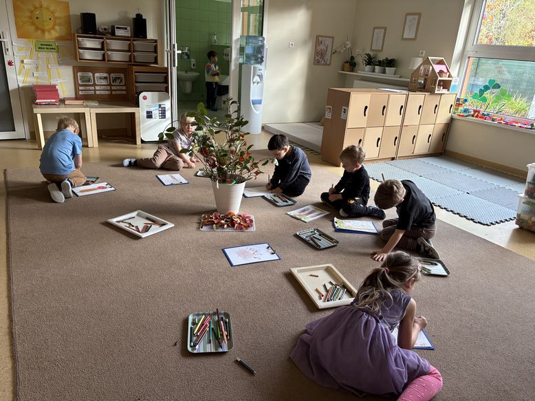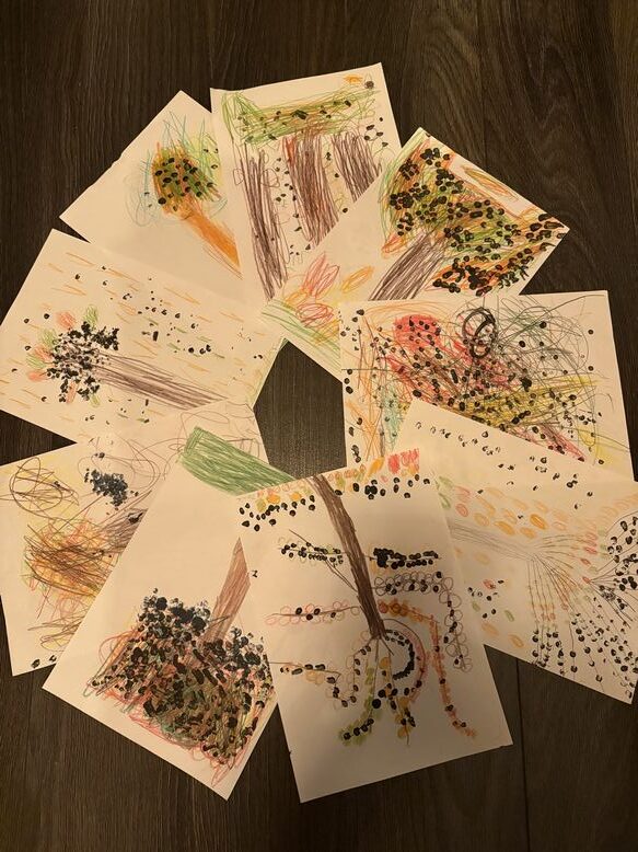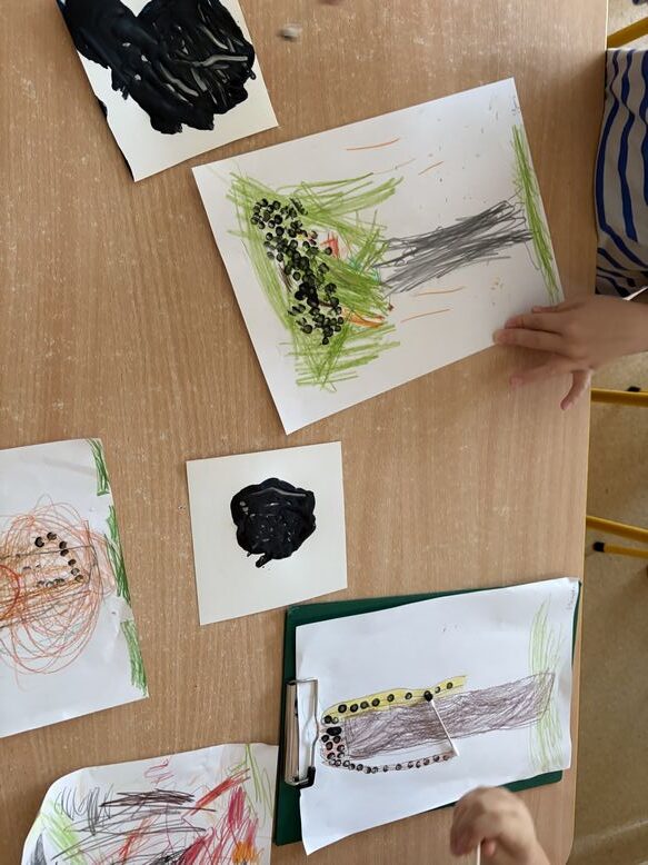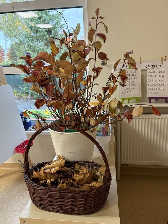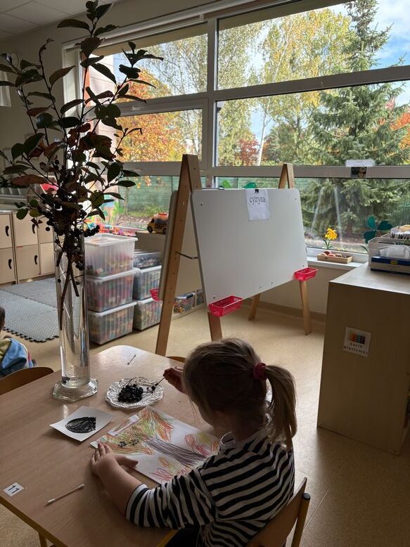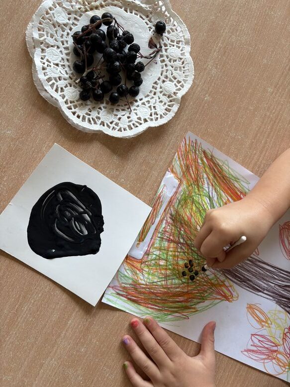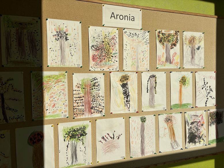 Wiał silny wiatr i w ogrodzie znajdującym się niedaleko przedszkola złamało się drzewo. Była to aronia. Gałęzie zostały przyniesione do naszej grupy. Rozmawialiśmy o tym co można zrobić z owoców aronii. Czy warto je jeść? Jeżeli tak, to pod jaką postacią? Szkicowaliśmy aronię, nadawaliśmy jej kolory kredką i malowaliśmy owoce farbą. I co jeszcze?….Zadziwiliśmy się pięknem kolorów aronii…