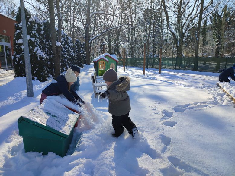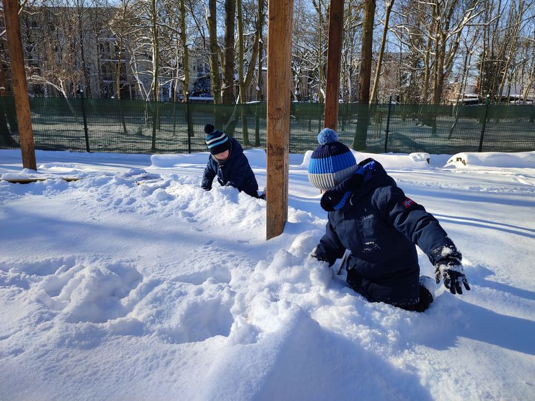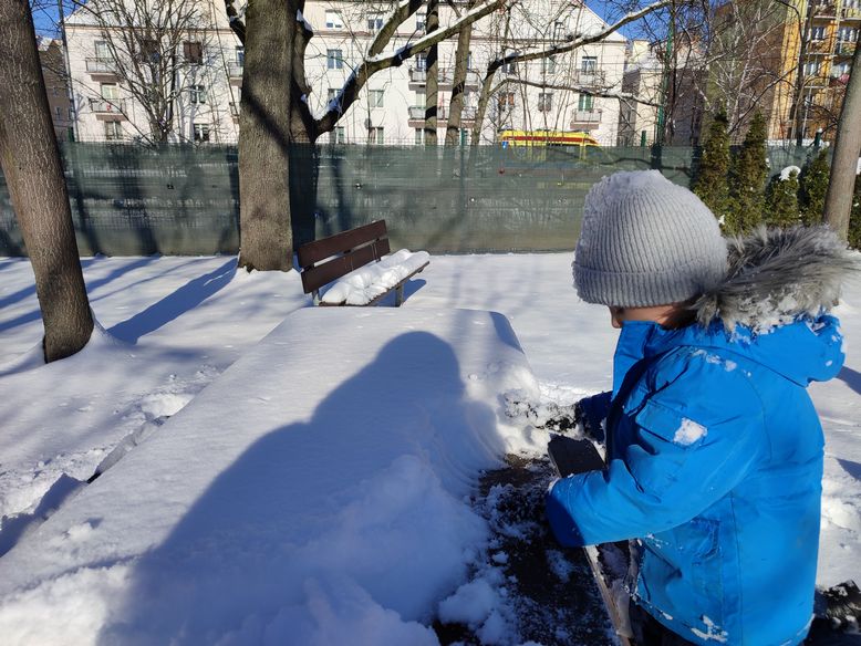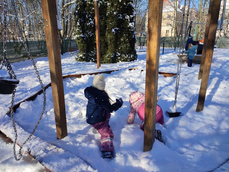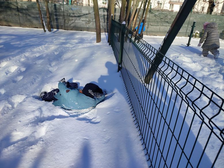 Nareszcie pojawił się śnieg. Cudownie biały, puszysty, dający radość i niesamowitą zabawę. Biały puch pokrył wszystko dokoła grupą warstwą. Doświadczaliśmy go na wszystkie sposoby, jakie przyszły nam do głowy, pomimo tego, że był zbyt sypki, żeby zrobić bałwana. Kładliśmy się na śniegu, robiliśmy „orła”, sprawdzaliśmy czy jest śliski, próbowaliśmy zrobić kulki, badaliśmy właściwości sopli i nie tylko. To była fantastyczna zabawa:)
