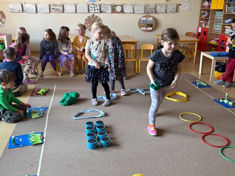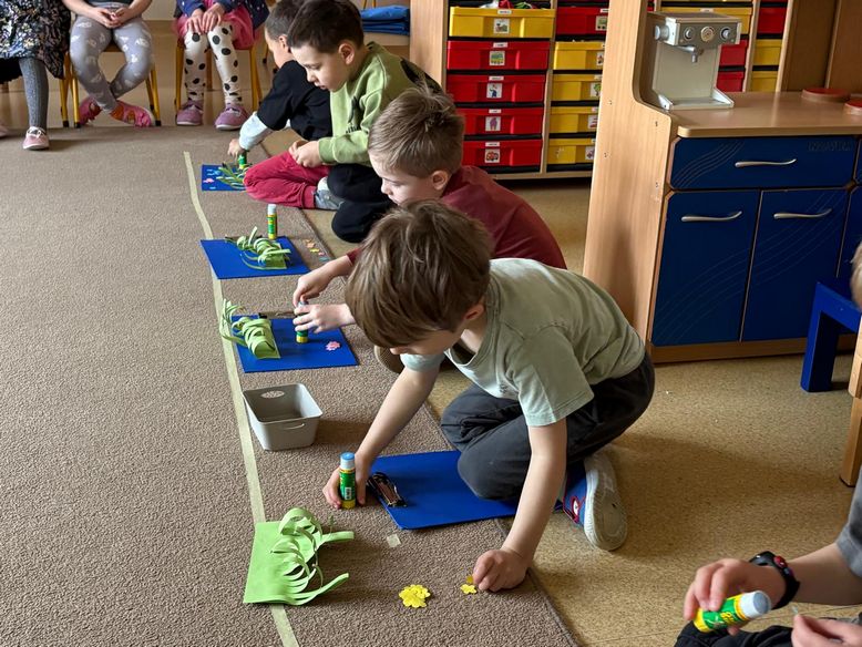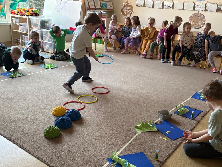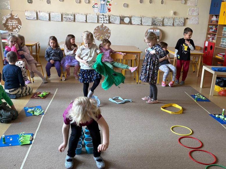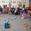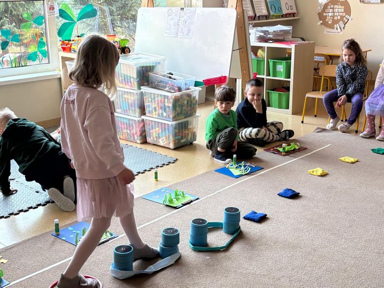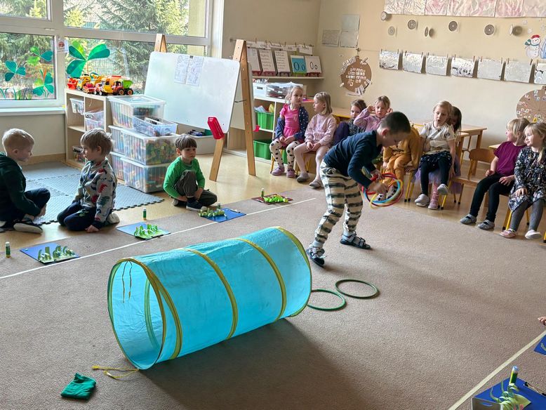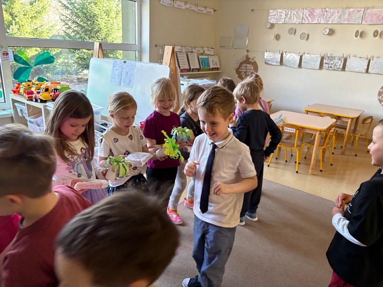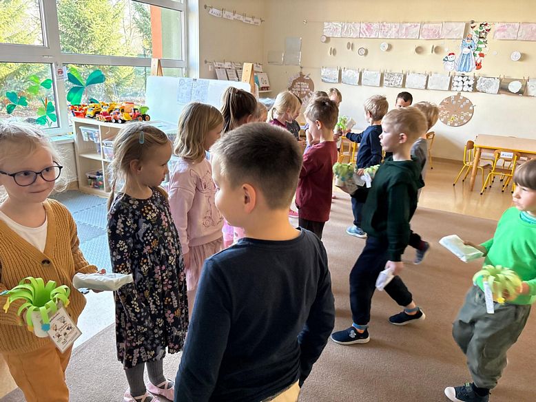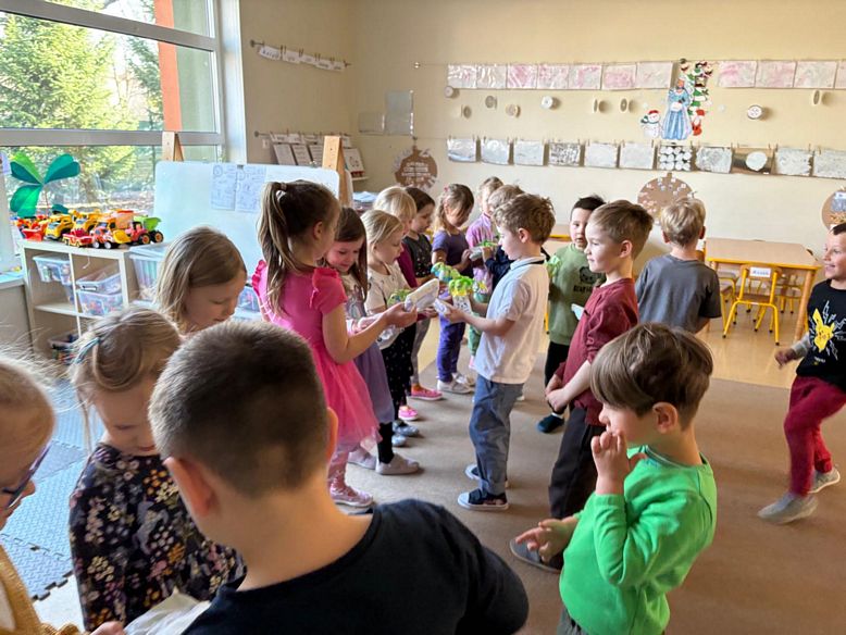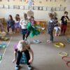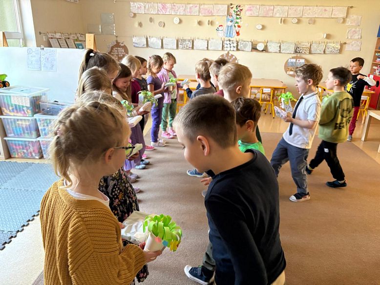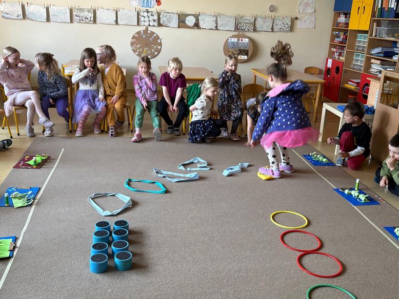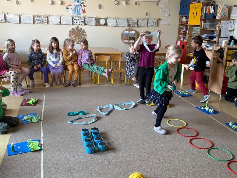 Chłopcy od rana przygotowywali materiały potrzebne do „wspólnego świętowania” – wycinali pomoce, wybierali sprzęt gimnastyczny, naklejali taśmę na dywanie, a potem pomagali w ustawieniu krzesełek dla dziewczynek. Chłopcy kolejno tworzyli dowolny tor przeszkód, a zadaniem dziewczynek było przejście po tym torze według instrukcji. Chłopcy byli równocześnie jurorami i za każde wykonane zadanie przyklejali dziewczynkom punkt w formie kwiatka. Na koniec powstał bukiet, który chłopcy wręczyli dziewczynkom…i oczywiście upominki. Było wesoło, a wszyscy weszli z zaangażowaniem w swoje role:)