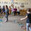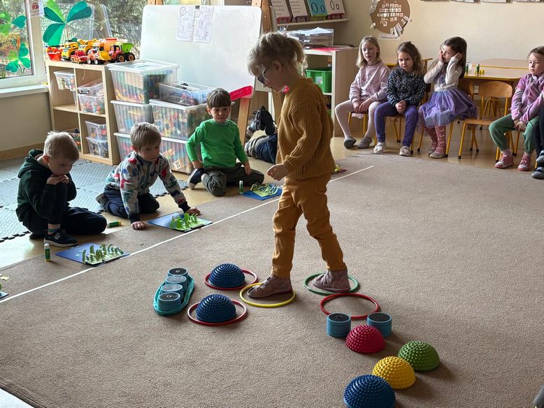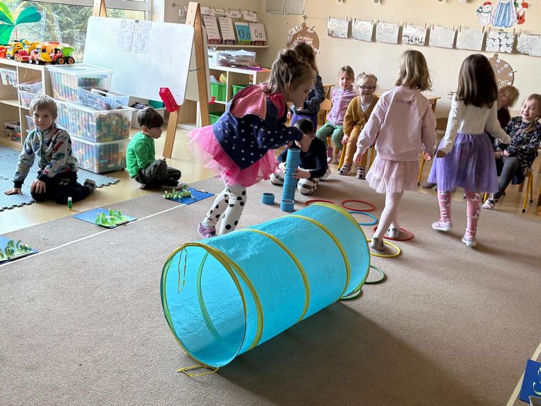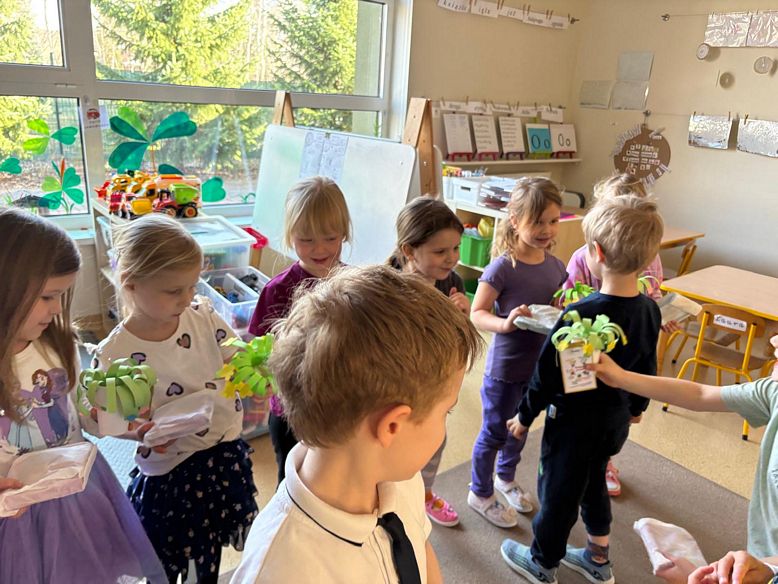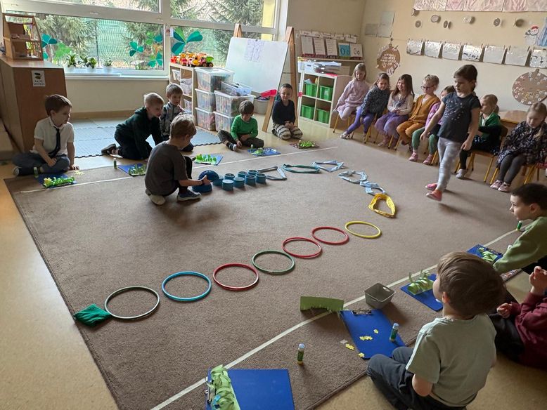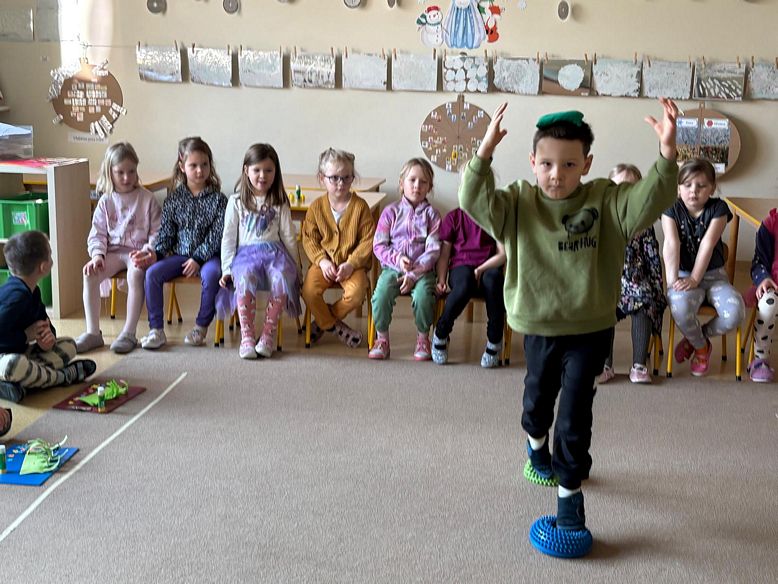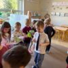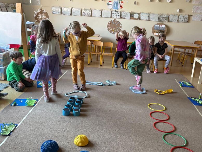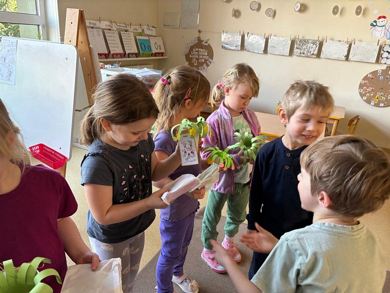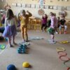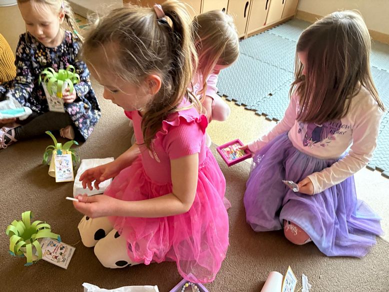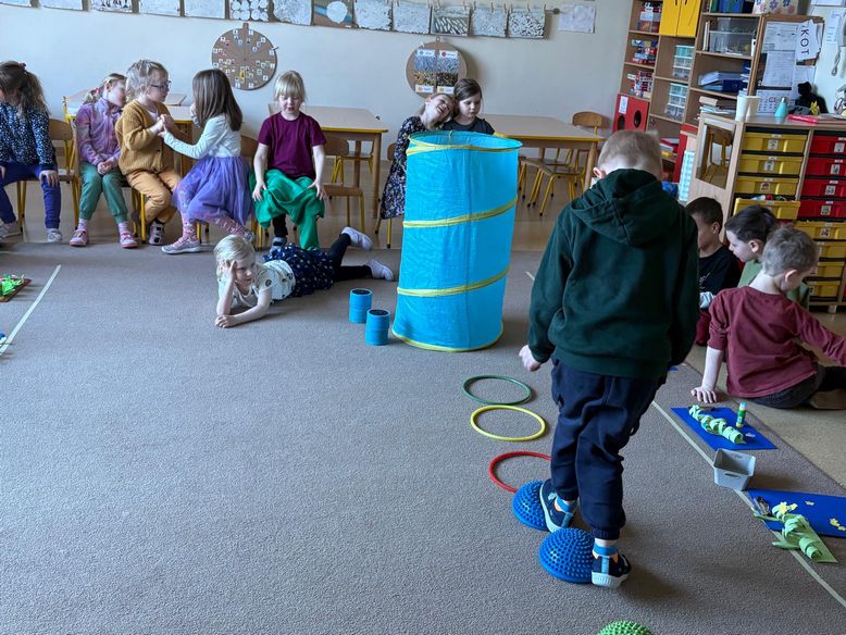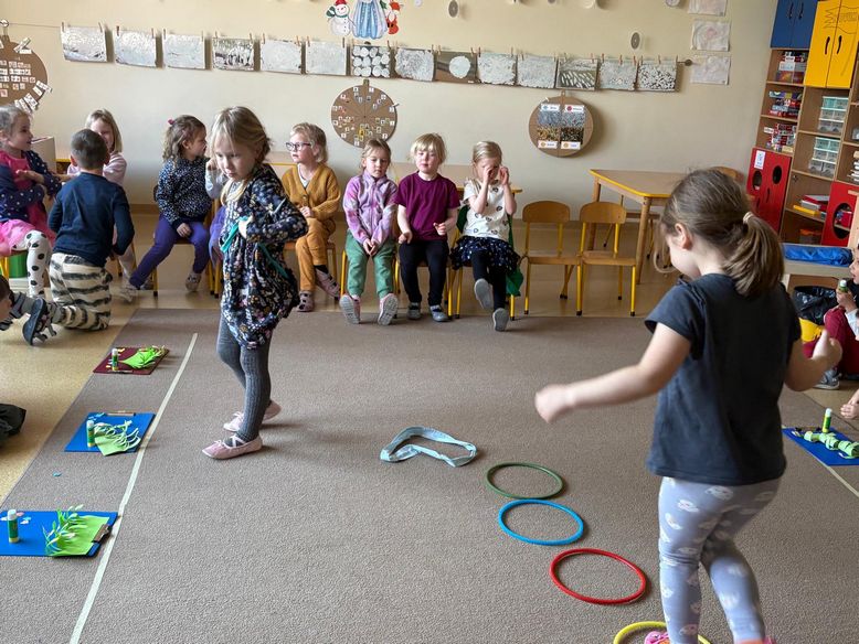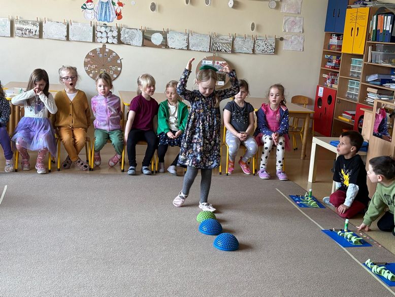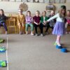 Chłopcy od rana przygotowywali materiały potrzebne do „wspólnego świętowania” – wycinali pomoce, wybierali sprzęt gimnastyczny, naklejali taśmę na dywanie, a potem pomagali w ustawieniu krzesełek dla dziewczynek. Chłopcy kolejno tworzyli dowolny tor przeszkód, a zadaniem dziewczynek było przejście po tym torze według instrukcji. Chłopcy byli równocześnie jurorami i za każde wykonane zadanie przyklejali dziewczynkom punkt w formie kwiatka. Na koniec powstał bukiet, który chłopcy wręczyli dziewczynkom…i oczywiście upominki. Było wesoło, a wszyscy weszli z zaangażowaniem w swoje role:)