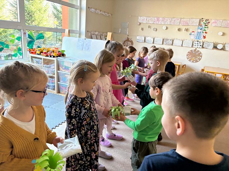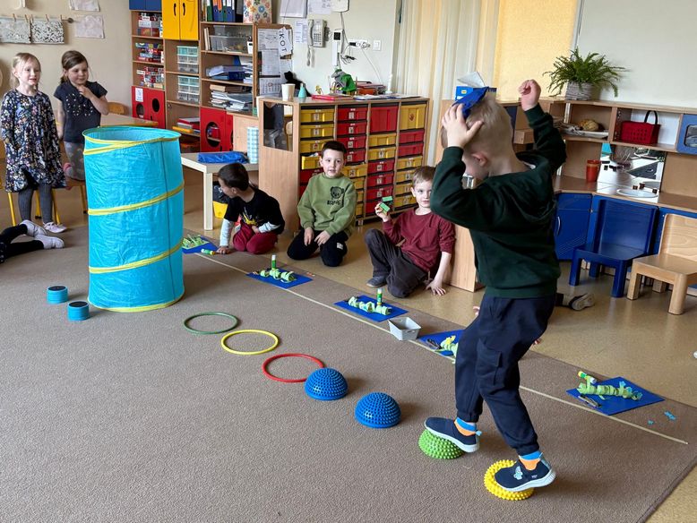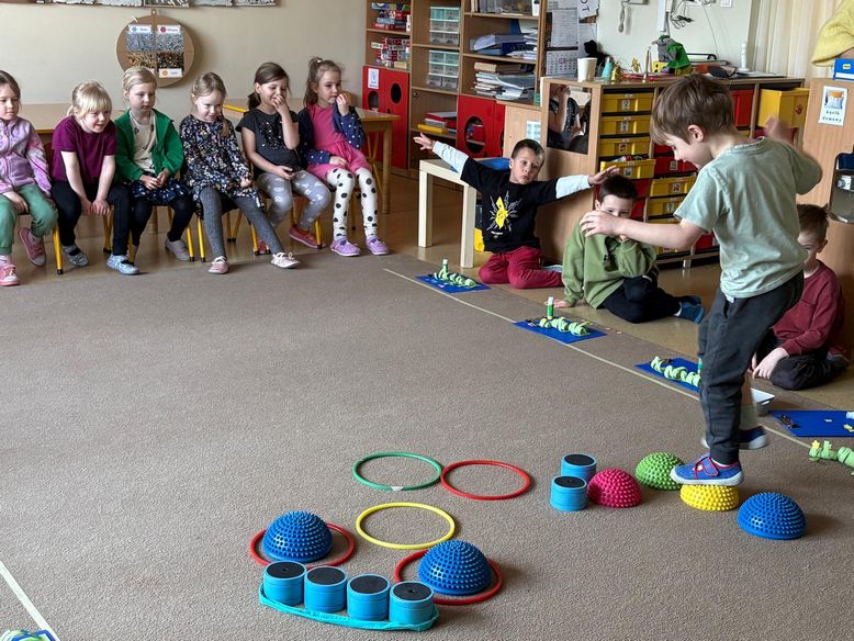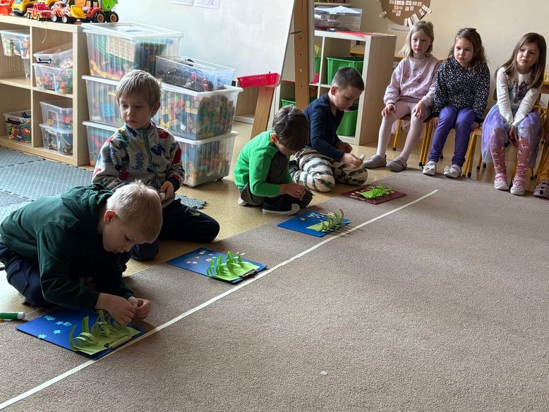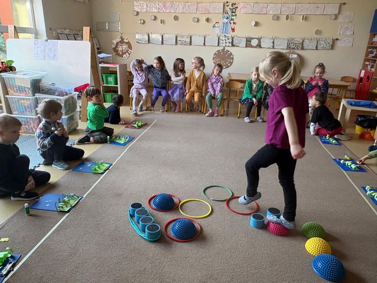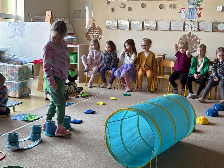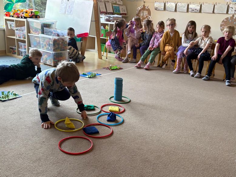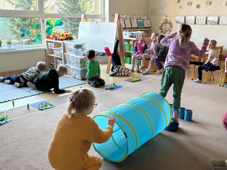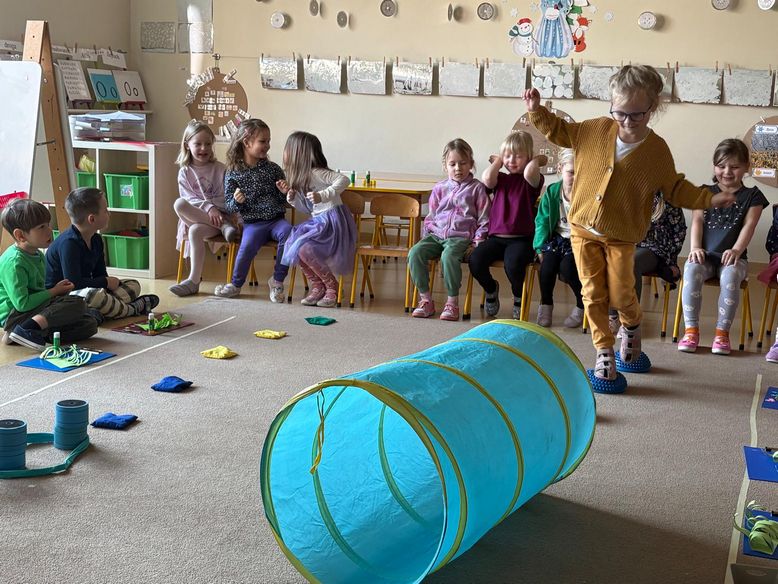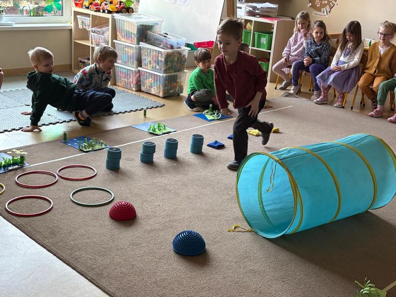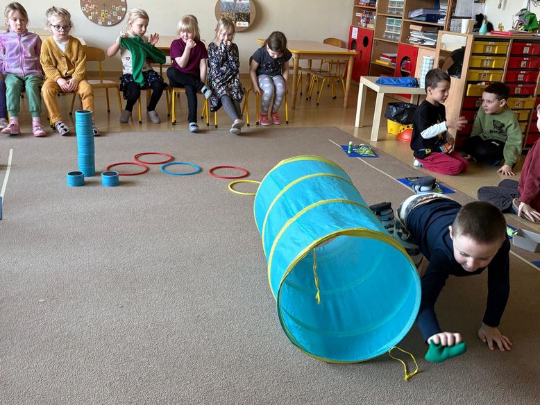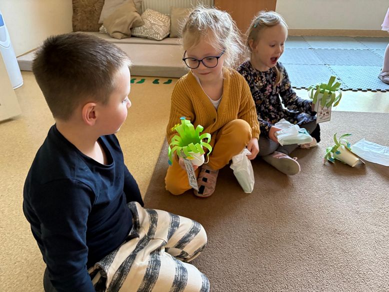 Chłopcy od rana przygotowywali materiały potrzebne do „wspólnego świętowania” – wycinali pomoce, wybierali sprzęt gimnastyczny, naklejali taśmę na dywanie, a potem pomagali w ustawieniu krzesełek dla dziewczynek. Chłopcy kolejno tworzyli dowolny tor przeszkód, a zadaniem dziewczynek było przejście po tym torze według instrukcji. Chłopcy byli równocześnie jurorami i za każde wykonane zadanie przyklejali dziewczynkom punkt w formie kwiatka. Na koniec powstał bukiet, który chłopcy wręczyli dziewczynkom…i oczywiście upominki. Było wesoło, a wszyscy weszli z zaangażowaniem w swoje role:)