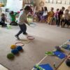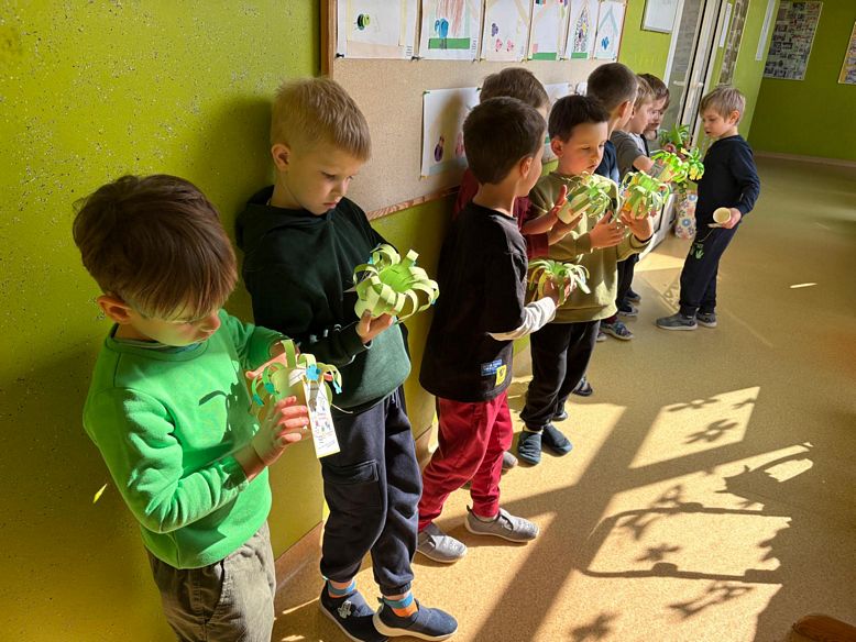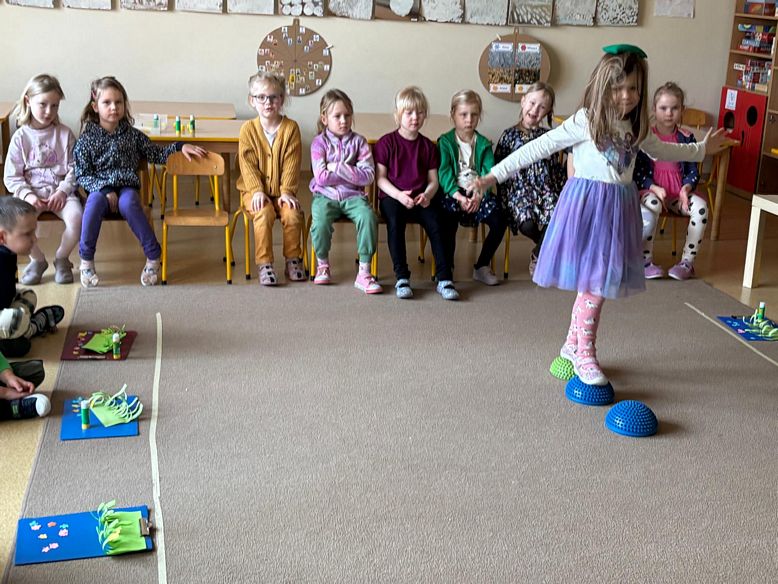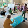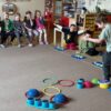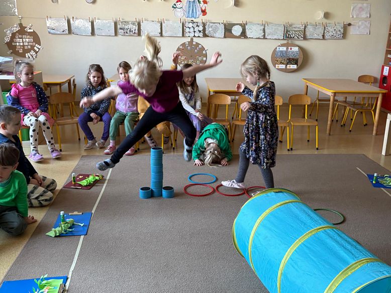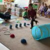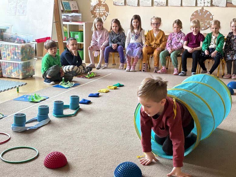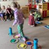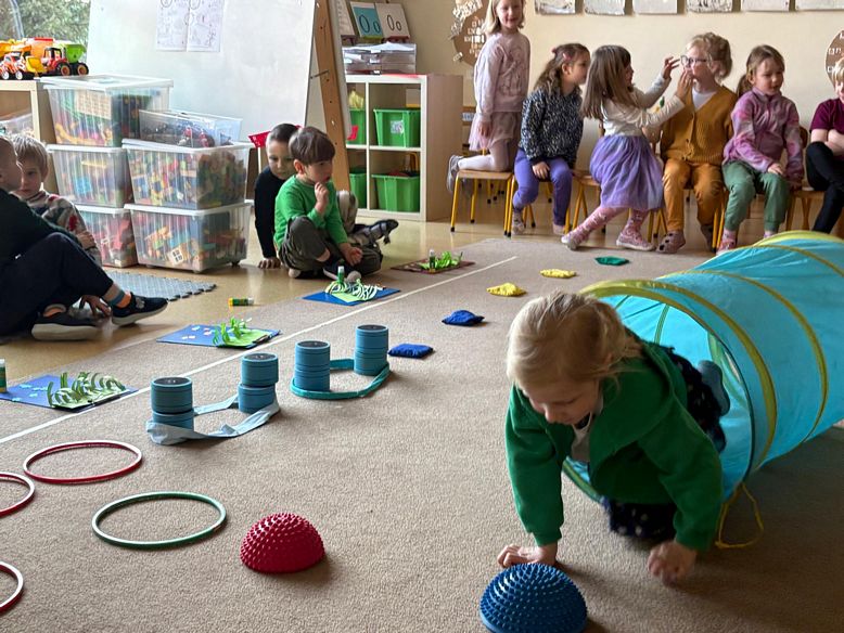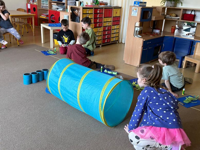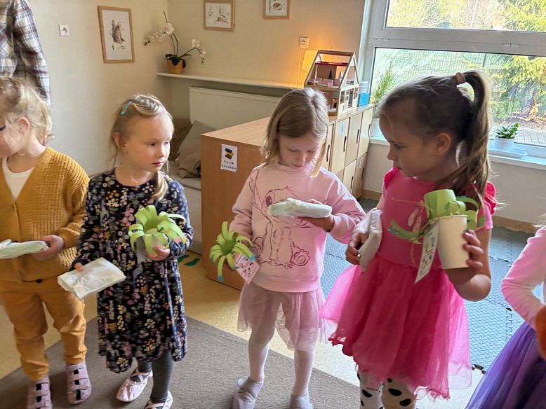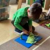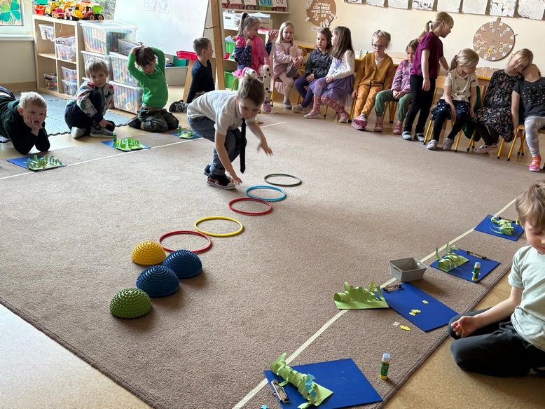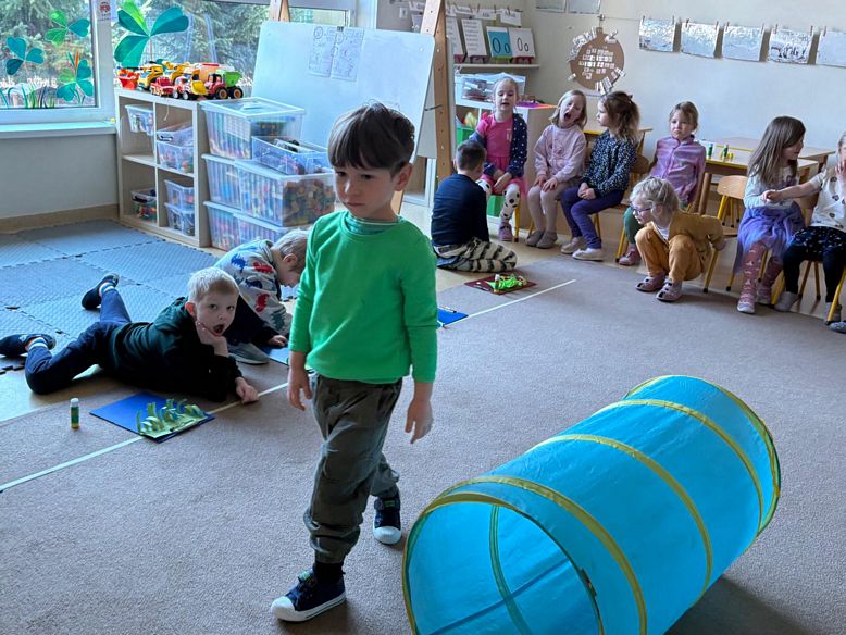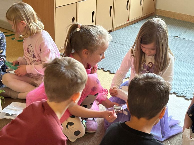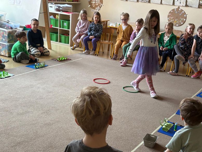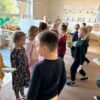 Chłopcy od rana przygotowywali materiały potrzebne do „wspólnego świętowania” – wycinali pomoce, wybierali sprzęt gimnastyczny, naklejali taśmę na dywanie, a potem pomagali w ustawieniu krzesełek dla dziewczynek. Chłopcy kolejno tworzyli dowolny tor przeszkód, a zadaniem dziewczynek było przejście po tym torze według instrukcji. Chłopcy byli równocześnie jurorami i za każde wykonane zadanie przyklejali dziewczynkom punkt w formie kwiatka. Na koniec powstał bukiet, który chłopcy wręczyli dziewczynkom…i oczywiście upominki. Było wesoło, a wszyscy weszli z zaangażowaniem w swoje role:)