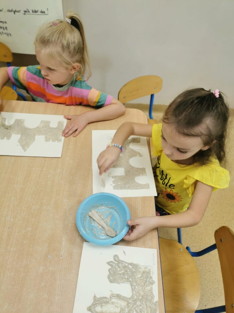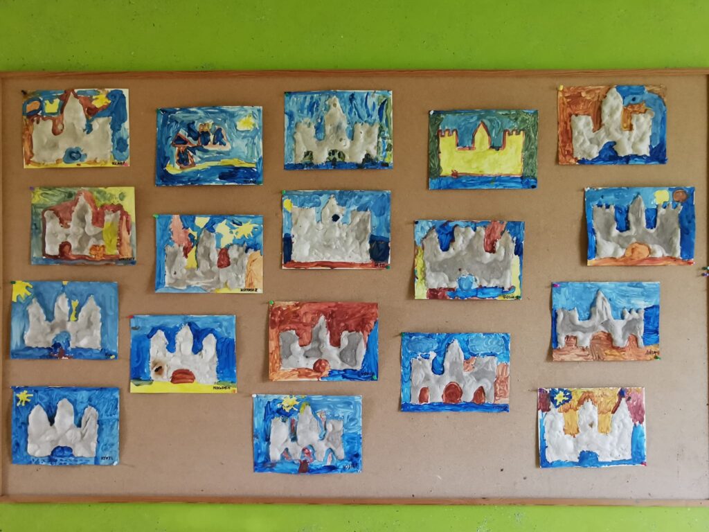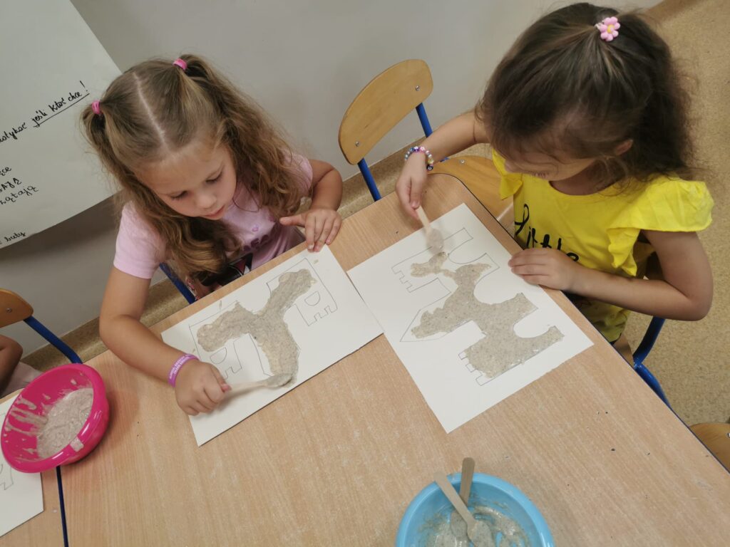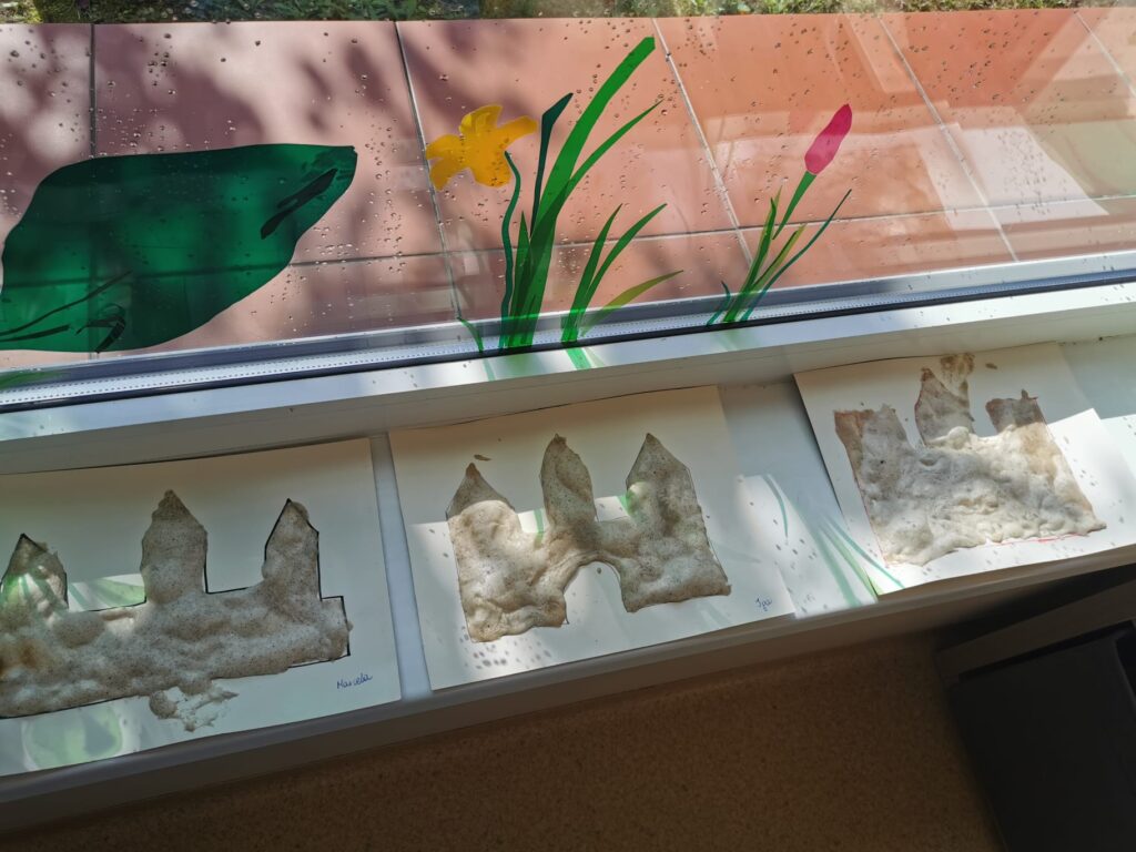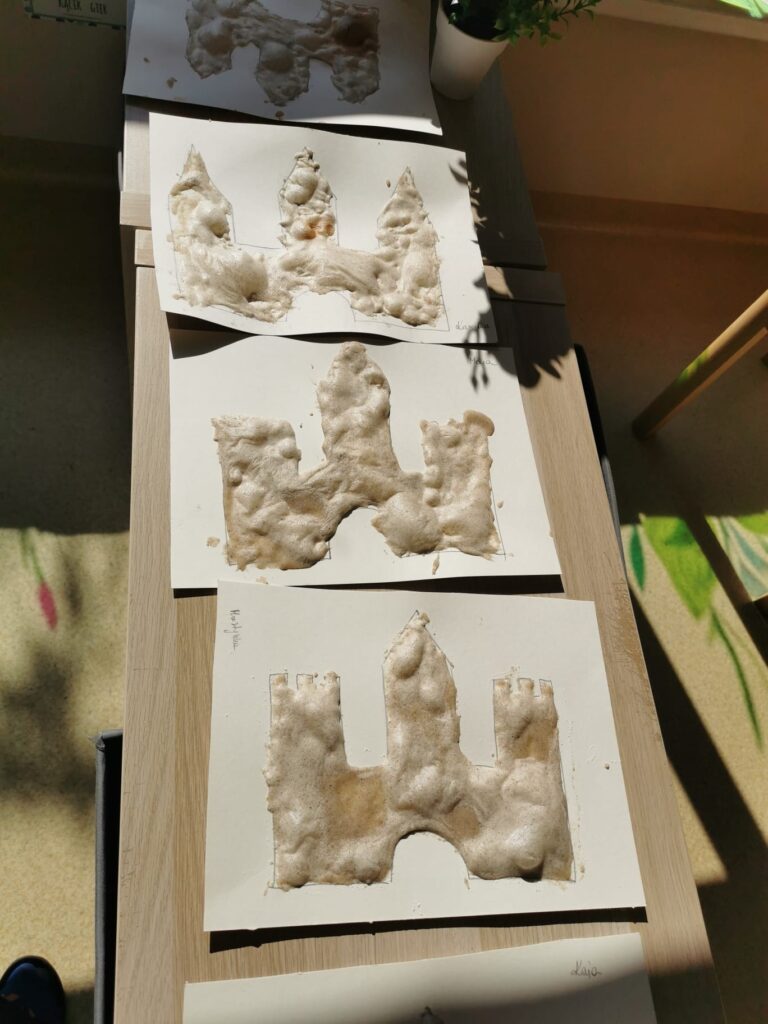 Chcąc nieco przedłużyć letnią atmosferę, postanowiliśmy zrobić zamki z masy piaskowej. Połączyliśmy mąkę, wodę, sól i piasek w odpowiednich proporcjach, przeliczając liczbę łyżek każdego składnika i z tak przygotowanej masy tworzyliśmy zamki, które wypiekaliśmy w kuchence mikrofalowej. Dzięki temu nasze zamki nabrały objętości i wyglądały jak prawdziwe!